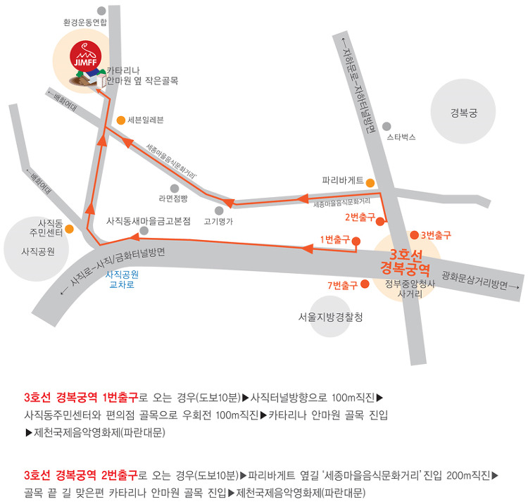 3호선 경복궁역 1, 2번 출구에서 도보로 5~10분 소요(자세한 약도는 아래 참고)